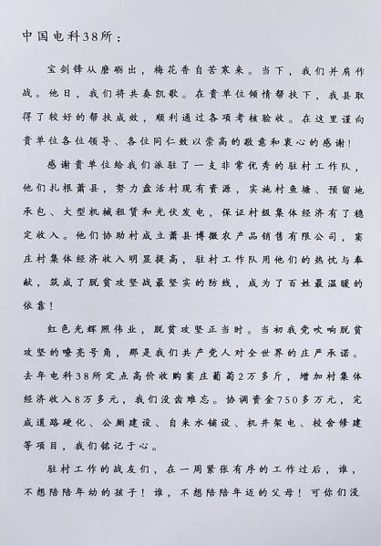 红色光辉照伟业,脱贫攻坚正当时。近期,38所收到来自安徽省宿州市萧县县委、县政府发来的感谢信,对38所的驻村扶贫工作表示感谢。