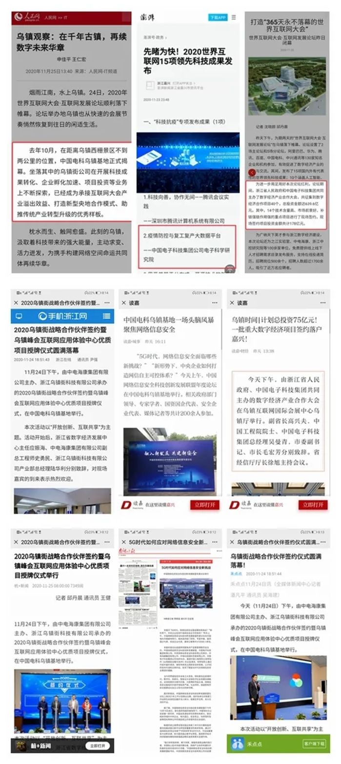期间,中国电科吸引了新华社、央视、光明日报、经济日报、中国青年报、中新社、人民网、新浪网、中国网、澎湃网等中央主流媒体、网络媒体,以及浙江日报、浙江在线、杭+新闻、明珠新闻、南湖晚报、嘉兴日报等浙江本地媒体的强势关注,爆点频出。