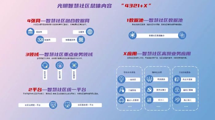 “作为‘智慧光明’24个核心构成板块之一,‘智慧社区’是全面提升社会治理体系与治理能力现代化的重要工程。”中国电科智慧院相关技术专家介绍说,“智慧社区”建设主要内容是“4321+X”。